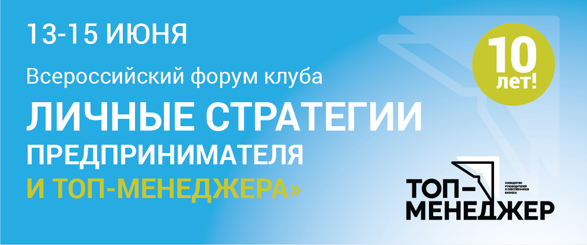 | Сообщество «Топ-менеджер, создающий будущее. Волга» при информационной поддержке ИД «Коммерсантъ», приглашает вас на всероссийский форум | | | | Личные стратегии предпринимателя и топ-менеджера | | | | 13–15 июня 2025 Загородный комплекс «Русская охота», Самарская область, п. Курумоч, ул. Садовая, 100а | | | | Это не просто встреча, а точка роста для вашей компании и личности, три дня интенсивного роста, вдохновения и нетворкинга экстра-класса! 👍 | | | | Почему вам нельзя пропустить форум? | | | - экспертные сессии: разбор трендов 2025–2030 гг. от лидеров рынка и первых лиц;